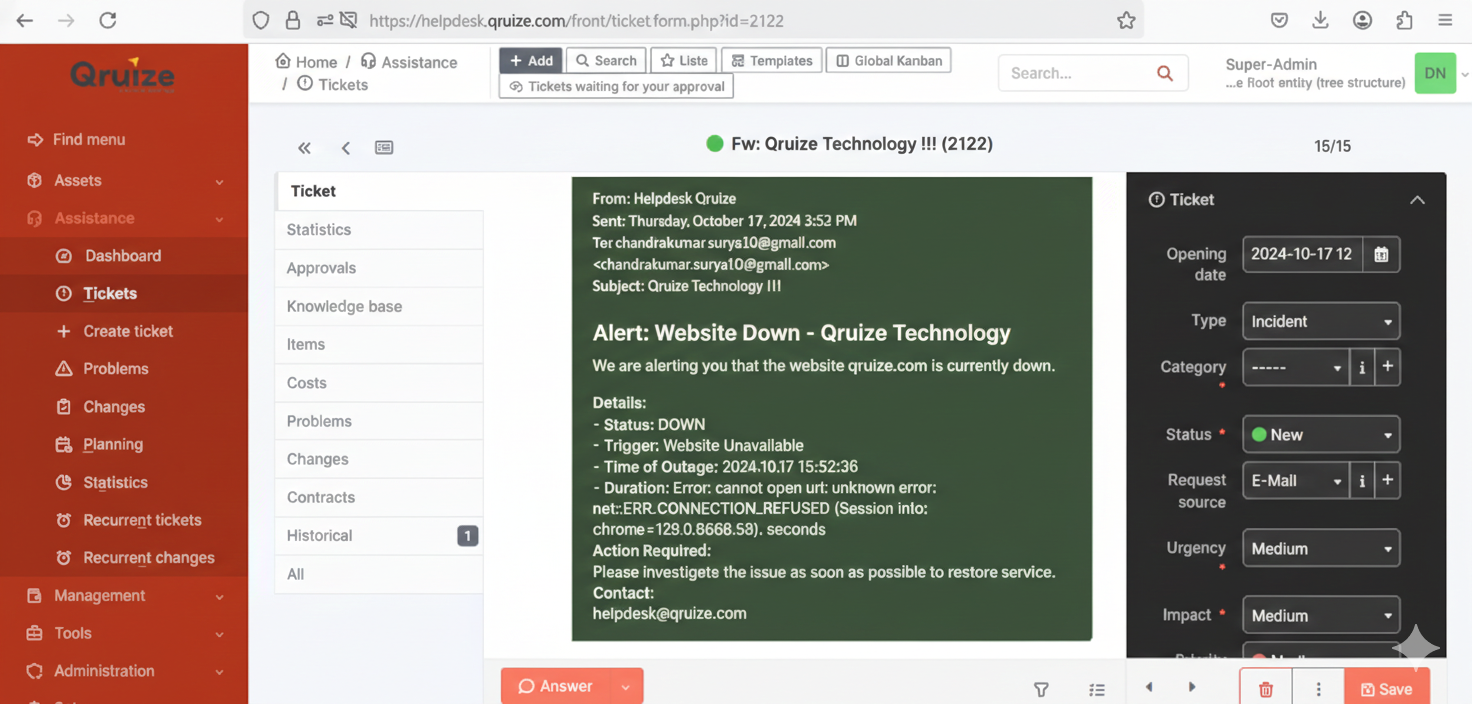 Automated notifications, including the ticket ID and alert details, are sent to the respective technical teams for timely resolution.